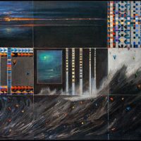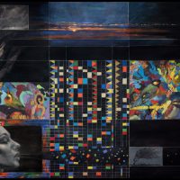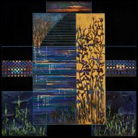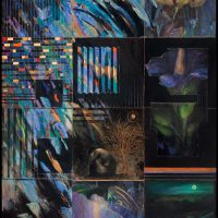 Elizabeth Myers Castonguay has spent a lifetime observing, researching, and making artwork about her passions: human diversity and the preservation of nature. Over the past fifteen years, the number of endangered species has risen from 40,000 to over one million. The artist’s paintings often depict humanity monochromatically with the endangered species in full color. Every species is critically important to the fine balance of nature though many cultures have an anthropocentric philosophy. Castonguay’s paintings are often divided into sections because all living beings are complex and sentient as scientists continue to discover. Colorful grids represent images of DNA common to all life forms.