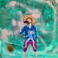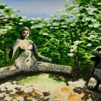 My main body of work is bright and dark acrylics on small portable wood panels, developed during 20 years at home in three continents. Increasingly I also produce large watercolors on paper, which means one chance in each layer of paint, and sculptures, in order to play with viewers from all perspectives.