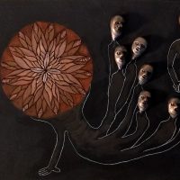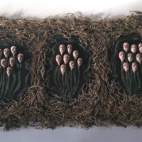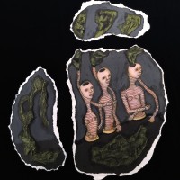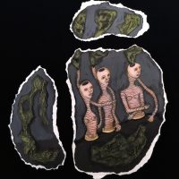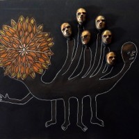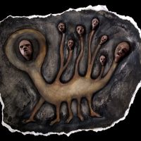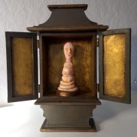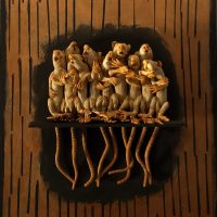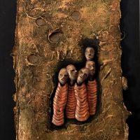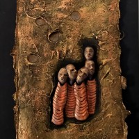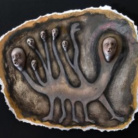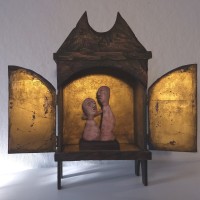 Current work is done with mixed materials including casein paint, pens and pencils, clay, white and black gesso, and various papers and board. Some pieces in my current show are wood shrines which I made several years ago but have filled with new inhabitants.”